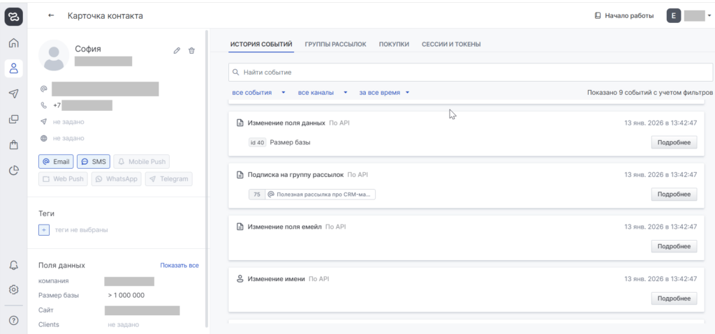 Например, в enKod для этого используется карточка контакта. В ней можно увидеть на какие каналы связи и группы рассылок подписан человек, узнать личную информацию, посмотреть события по емейлам: открытия, клики. Если пользователь сделает заказ или оставит свои данные во всплывающем окне, это тоже отобразится в системе.