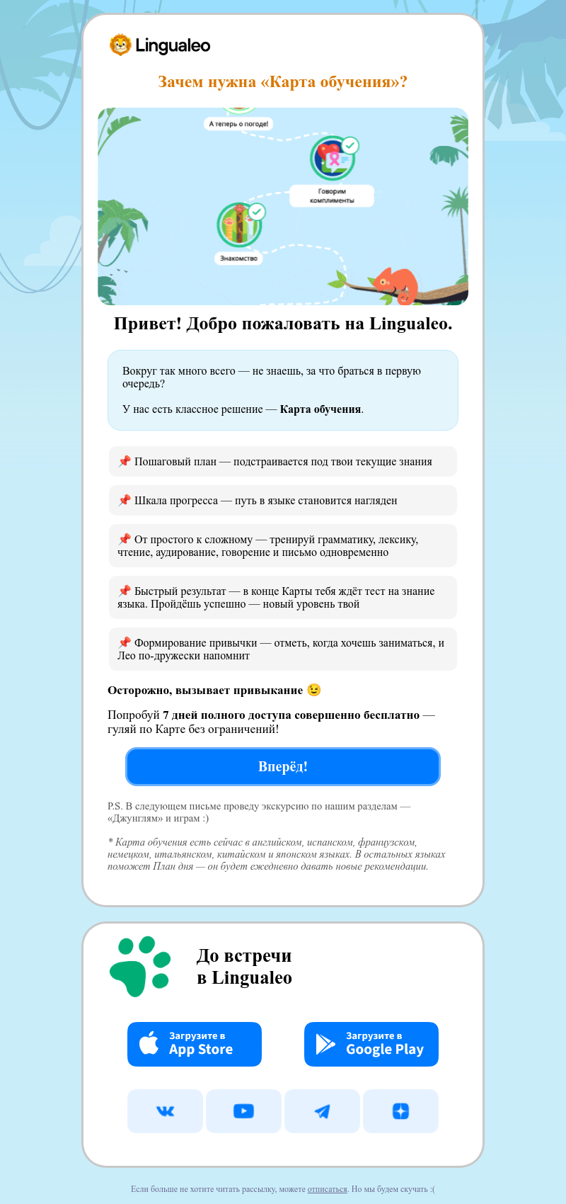 После регистрации пользователю приходит лаконичное письмо, в нём рассказывается о «Карте обучения», которая позволяет пользователю выстроить пошаговый план в изучении языка. В конце есть элемент продажи — пользователю ненавязчиво предлагают пробный доступ к премиум-подписке.