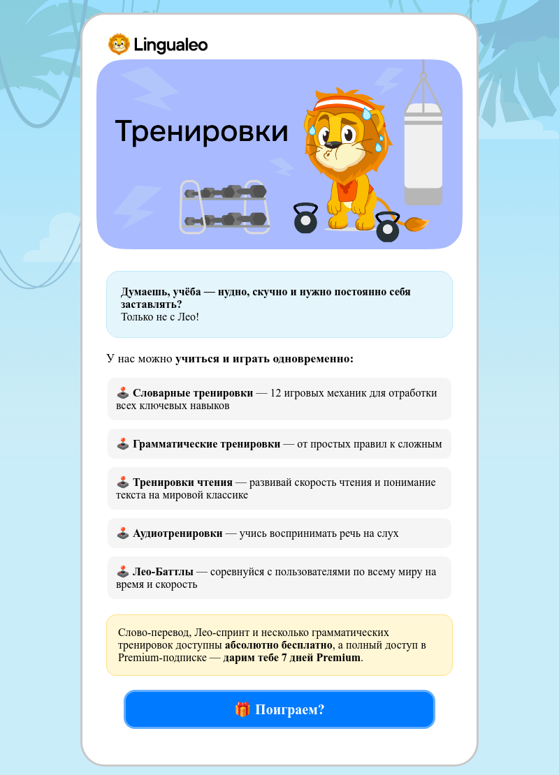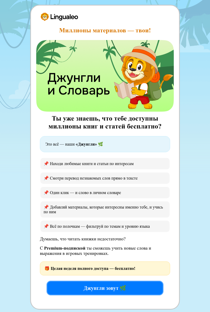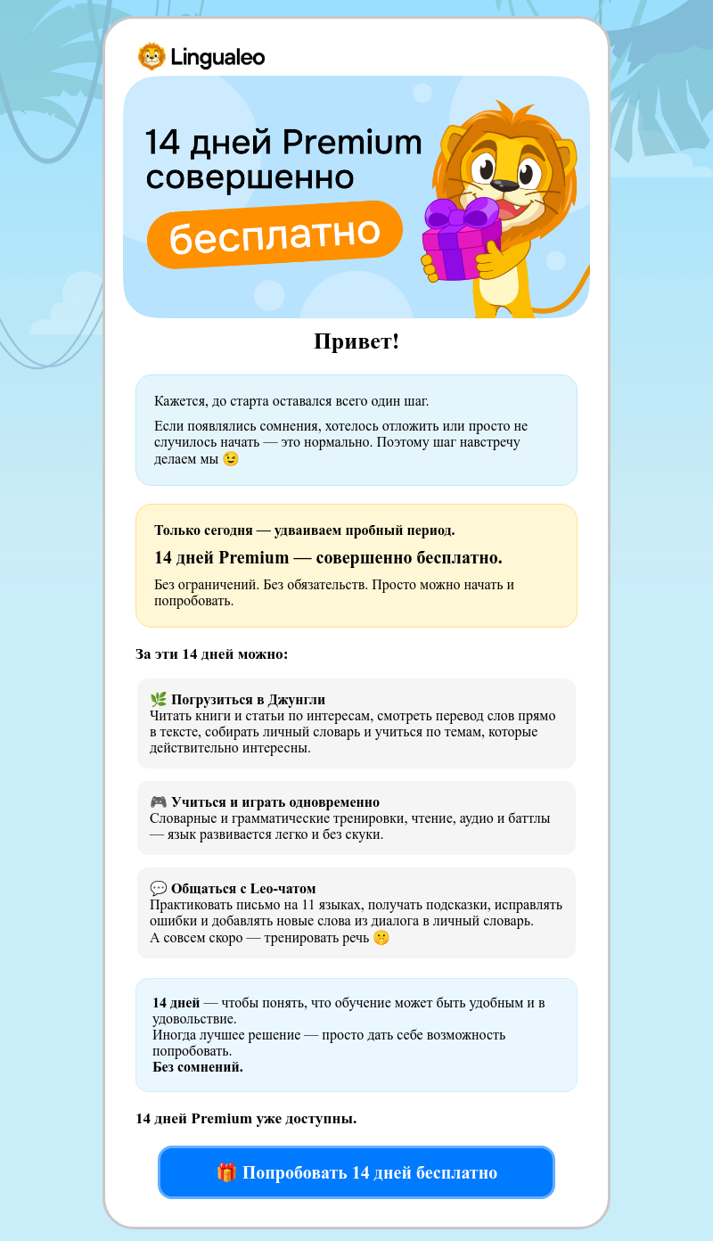 Финальное письмо для новых пользователей Lingualeo с продажей бесплатной пробной версии премиум-подписки на 14 дней