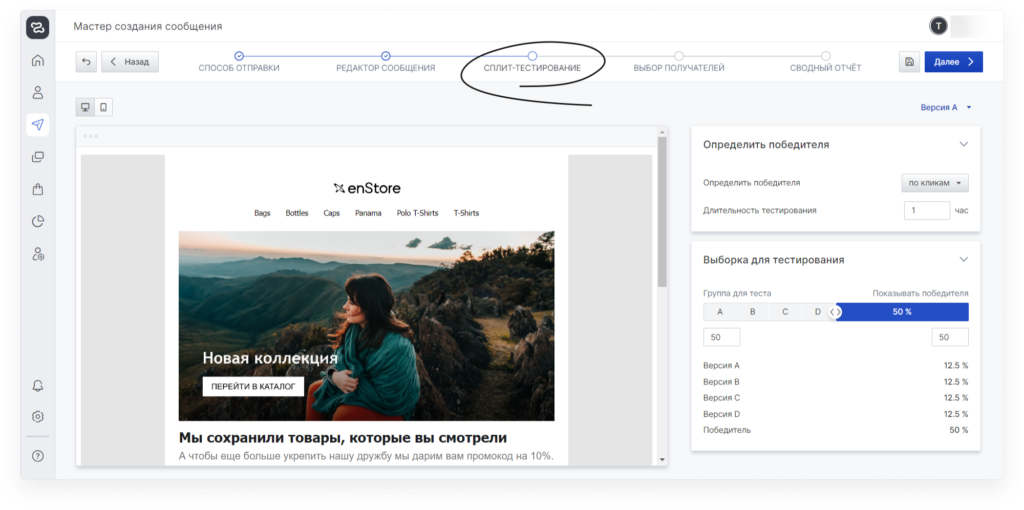 A/B-тестирование. На других платформах, с которыми работала компания ранее, A/B-тестирование было реализовано неудобно — требовалось заходить в отдельные вкладки и настраивать всё вручную. В enKod A/B-тест делается в пару кликов прямо из рассылки.