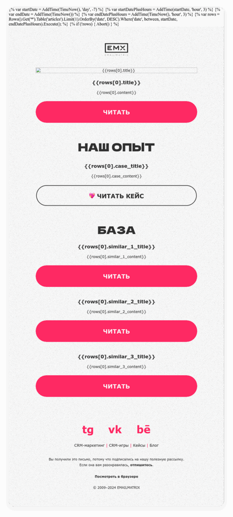 - Настроили динамический контент (ДК) в письмах. Специалисты EMAILMATRIX отметили гибкую настройку ДК и возможность вывода различной информации.
