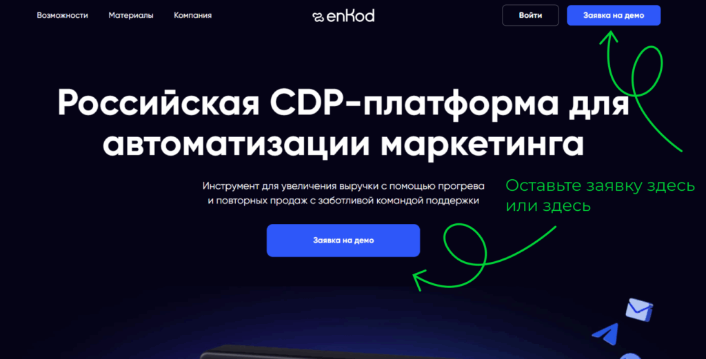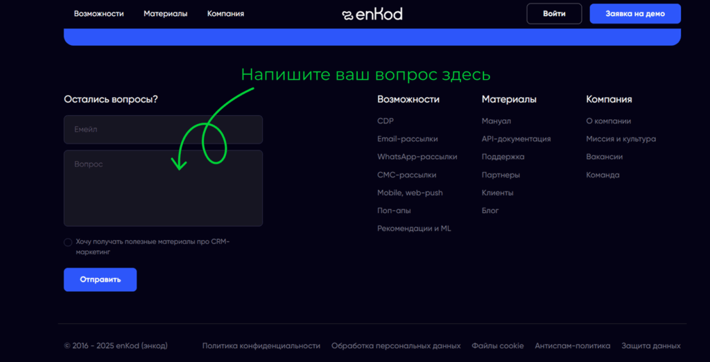 Спасибо, что заглянули на наш сайт. Кто мы? enKod — это удобная платформа для CRM-маркетинга. Она экономит время маркетолога, сокращает рутинные задачи и помогает увеличить повторные продажи. enKod — сервис с человеческим лицом, в котором поддержка — не бездушные чат-боты, а люди, которые не оставят вас один на один с вашим вопросом. Пройдите короткий опрос ниже, чтобы понять, подойдем ли мы вам.