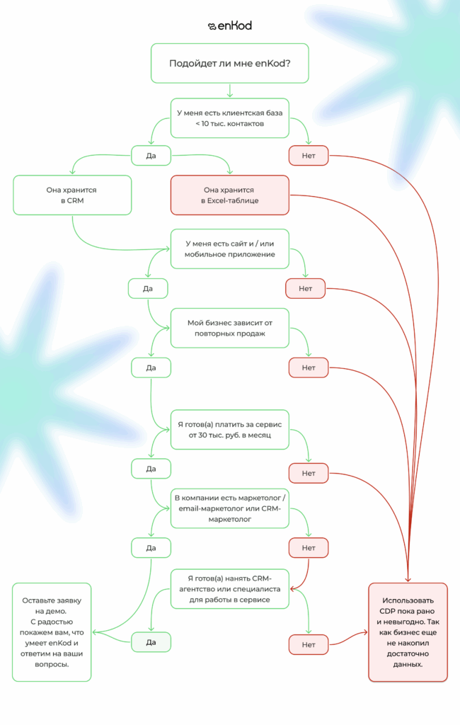 Прежде чем оставить заявку без лишних звонков проверьте, подойдет ли вам enKod. Просто ответьте на вопросы на схеме ниже.