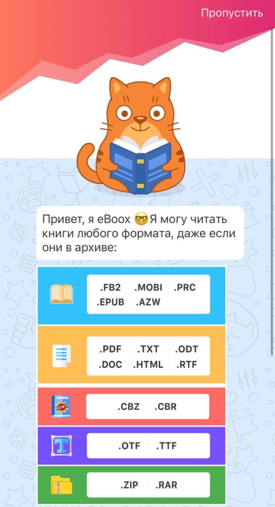 В приложении для чтения книг eBoox котик сопровождает пользователя на старте, а также встречается на экране с обратной связью.