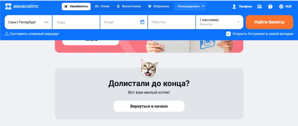«Авиасейлс» спрятал милого котика в подвале сайта. Каждый раз, когда пользователь пролистывает до конца, полосатик предлагает вернуться в самое начало.