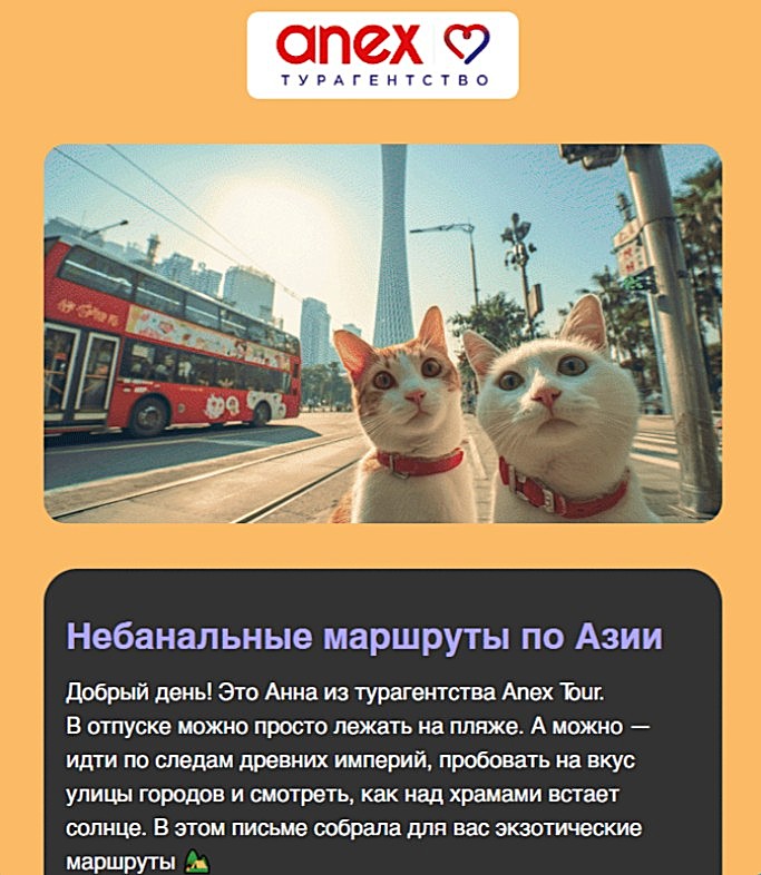Маркетологи из турагентства Anex вместо стандартных картинок показали в рассылке места для путешествий, где в роли туристов выступили кошки.