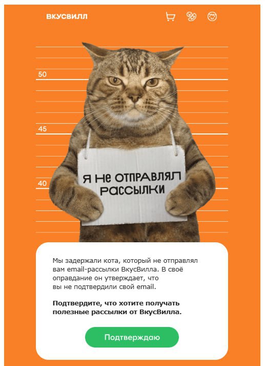 «ВкусВилл» использовал образ котика в рассылке, чтобы запросить согласие пользователей на получение новых писем. Ну, как тут не согласиться? Мур 🙂