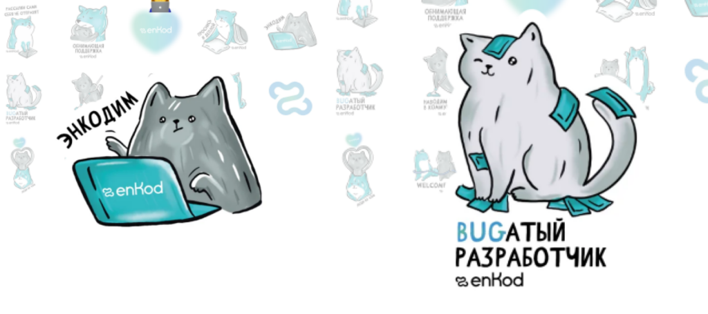 Любовь к котикам в enKod настолько велика, что мы добавили их в стикерпак, затем они стали появляться в нашем мерче (у нас есть футболки с котиком слева) и в других товарах. Его ошибочно можно принять за маскота, но официально он им не является.