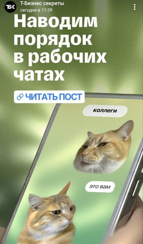 Еще один пример — сторис с котиками в Telegram-канале «Т-Бизнес секретов», которые привлекают внимание к основному посту.